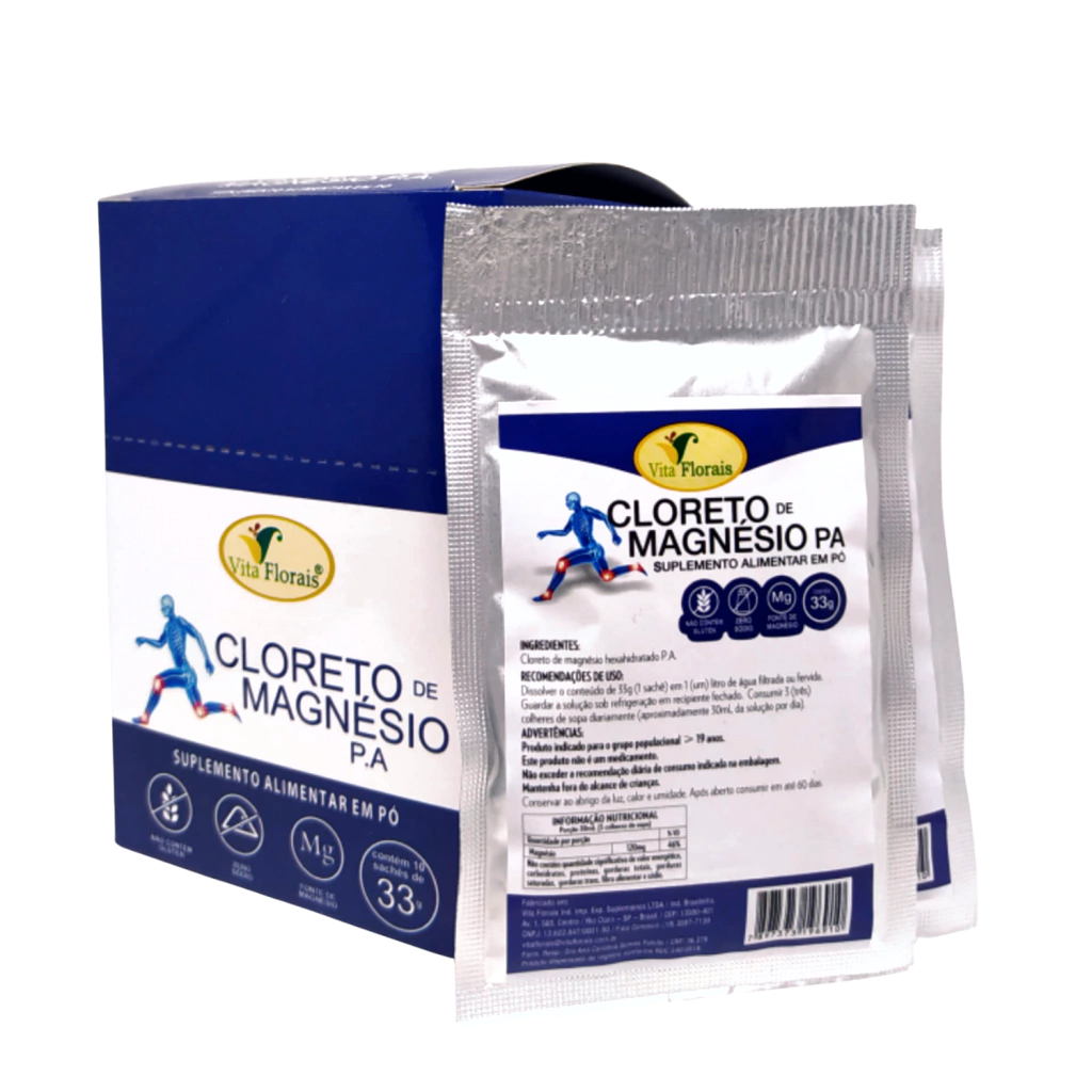 O magnésio auxilia na formação de dentes e ossos, no metabolismo energético, metabolismo de proteínas, carboidratos e gorduras, auxilia no funcionamento muscular, também auxilia no funcionamento neuromuscular. O cloreto de magnésio Vita Florais é uma fonte de magnésio.